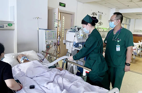 患者在急诊抢救室的第八天早上8点45分,护士刘杰先行将有创呼吸机推到血液透析室连接氧源并运行正常后,副主任韩超和护士王旭男携带抢救药品和设备,一路护送患者至血液透析室,在途中给予气管插管接简易呼吸器辅助通气,患者血氧一直维持在96%以上。在血液透析的3个多小时里,王旭男一直严密监测患者的生命体征及各项呼吸机参数,并实时观察患者的状态。透析结束后,杨勇主任来到透析室查看患者病情,并和护士王旭男一起将患者接回抢救室。整个过程,急诊科医护人员配合默契,齐心协力保证了患者生命体征的平稳和血液透析治疗的实施。患者的状态明显好转。当看到医护人员额头上的汗珠及湿透的衣服时,家属不住地频频道谢!